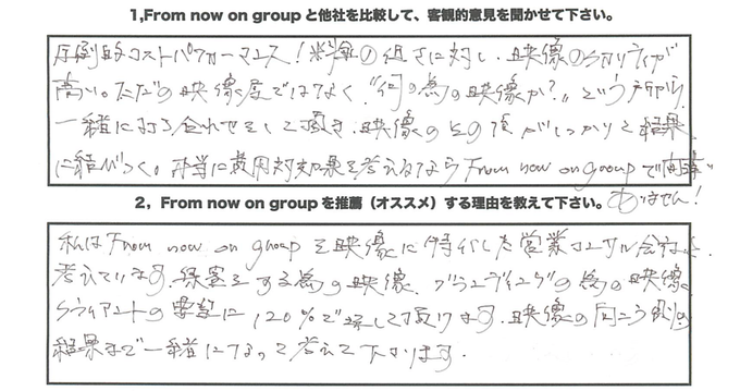 圧倒的コストパフォーマンス!料金の低さに対し、映像のクオリティが高い。ただの映像屋ではなく”何の為の映像か?”という所から一緒に打ち合わせして頂き、映像のその後がしっかりと結果に結びつく。本当に費用対効果を考えるならFrom Now On Groupで間違いありません。