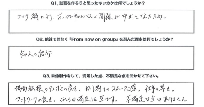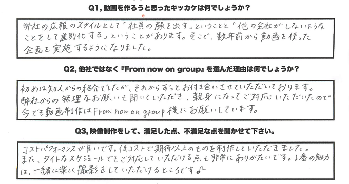 初めは知人からの紹介でしたが、それからもずっとお付き合いさせていただいております。弊社からの無理なお願いでも聞いていただき、親身になってご対応いただいたので今でも動画制作はFrom Now On Group様にお願いしています。