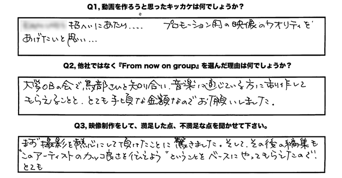 まず撮影を熱心にして頂けたことが驚きました。そして、その後の編集も”このアーティストのかっこ良さを伝えよう”ということをベースにやってもらえたので、とても!