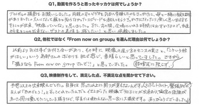 ブライダルの撮影をお願いしました。両親の式のビデオをDVDへ変換したのをきっかけに、母と一緒に観る機会がありました。大人になってみると知らなかったエピソードを教えてもらうきっかけになったり、楽しく思い出話することが出来、「映像っていいな」と思いました。また式の間、会場に入れる時はわずかなので、私から見ることが出来ないゲストの表情を残したい!と思い依頼しました。